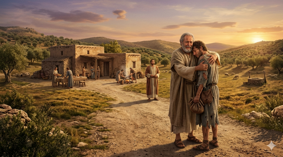The parable of the Prodigal Son tells the story of two brothers. One leaves home, wastes his inheritance, and returns broken. The other stays home, working faithfully with his father. When the younger son comes home, the father runs to him, embraces him, and kisses him.